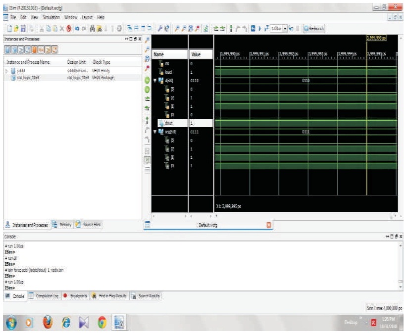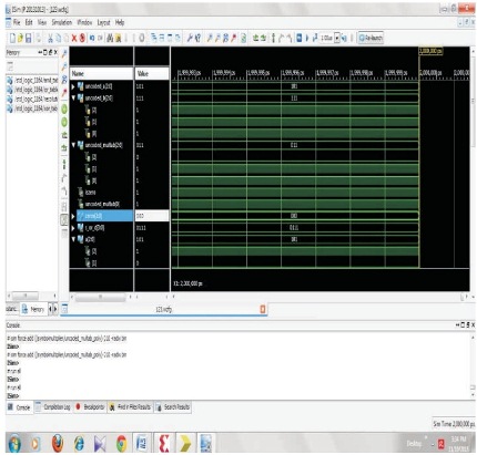 From the BCH circuit, a signal is needed to allow the data signal to enter the encoding circuit and pass the output at the same time. It offers flexibility to select code parameters namely block length and code rate and the error location polynomial coefficients of BCH code are computed. The input is given and for each BCH code a terror correcting code is assigned which can detect and correct up to (t) random errors per code word and the clock frequency is reduced at the particular time as shown in Figure 5.