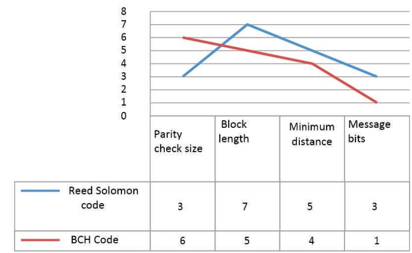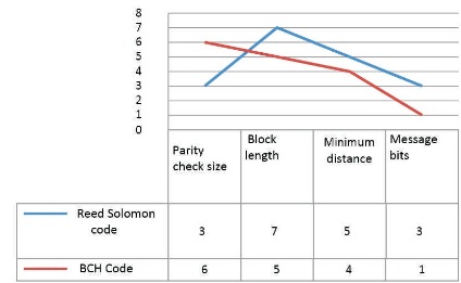 In the Reed Solomon code the graph is drawn from the (n,k) and the block length and minimum distance are compared for the parity check size and message bits. This is greater than the code word and the size is always maximum as shown in Figure 6.