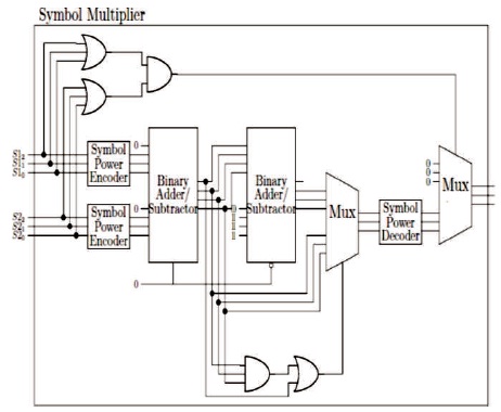 The input system of each symbol should pass through a symbol power encoder as shown in the Figure 1. This encoder will map each symbol power into its equivalent decimal. This mapping process is much smaller than the one required mapping all multiplication possibilities between 3 bit symbols. This mapping only maps 7 different patterns a table is used to map 64 different patterns of full multiplier encoder. As in algebra in order to multiply both symbols the powers can be added. The Binary Adder/ Substractor unit take the output of each symbol power encoder and add them together using a standard binary adder. As the maximum value of each power is 6, the sum of the symbols would never be greater than 12, which in binary can be represented using 4 bits. Hence the binary adder would take 8 inputs and return 4 outputs. The Adder and Subtractor are in the same block and the operation performed by the adder/ substractor unit is controlled by logic variable. Multiplexer is used to select one of the outputs. It is used to select the three least significant bits since those are the bits that have the information about the symbol power, which has to be decoded. This multiplexer will select the subtractor signal if the result of the adder is either 0111 or if the most significant bit is high, which means the addition was greater than seven. The output of the Multiplexer is then send to a Signal Power Decoder, that uses the reverse encoder logic. The system will not consider the zero symbols because zero cannot be represented as a power of a number. Although just as in algebra when a BCH code is a ‘t-error’ correcting code in that it can detect and correct up to t-random errors per code word. The Hamming single error correcting codes can be described as BCH codes. The BCH codes offer flexibility in the choice of code symbol is multiplied by zero the output should be zero and a final multiplexer should select either zero or the output of the symbol power decoder for the output of the system. If either of the input symbols is zero then this multiplexer will select zero as the output, but if both of them have at least one bit not equal to zero then the output will be given by the output of the decoder.