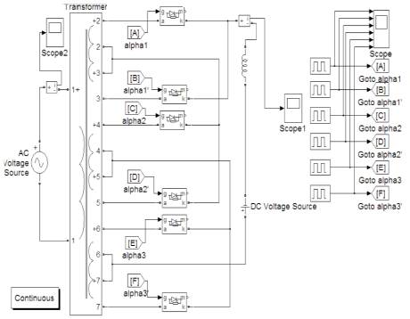 Figure 1 shows SIMULINK model of a grid interactive inverter. The simulation work is basically done to study the THD variation of the line current with the triggering angle combination and utilise it in designing a practical microcontroller based triggering circuit. Here the triggering pulses are given from the pulse generator block of the simulink blockset. The value of inductor is 200 mH. The transformer ratio is 230V:50V:0:50V for each secondary winding. The lower leg of each converter is triggered at a phase delay of 180o to the upper leg. The battery has been used as the DC source. PV array, rectified voltage from wind turbine or any other renewable DC source can also be used instead of the battery. The line current with harmonics is shown in Figure 2. Table I shows the variation of total harmonic distortion with the variation of switching angle. It is evident from Table I, the lowest THD has been achieved for triggering configuration as α1 =105o, α2 =125o and α3 =155o. Practically, the THD is reduced further due to residual inductance of the circuit. Therefore this combination is selected for the development of the practical triggering circuit and grid interactive inverter.