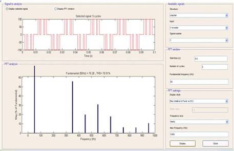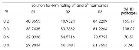 Table 1 shows the firing angles obtained to eliminate the 3rd and 5th harmonics present in the inverter output for different modulation indices. The corresponding percentage voltage total harmonic distortion (THD) is also given. As the lower order harmonics are eliminated by selective harmonic elimination, only higher order harmonics will be present in the output. Designing a suitable low pass filter will further reduce the %THD to a minimum value.