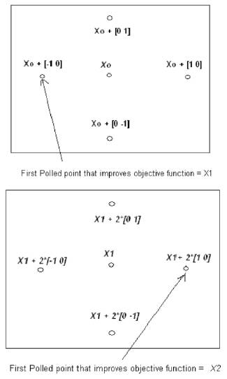 The algorithm polls the mesh points by computing their objective function values until it finds one whose value is smaller than the objective function value of X0. If there is such point, then the poll is successful and the algorithm sets this point equal to X1, (X 0 + [−1 0] as in Figure 3).