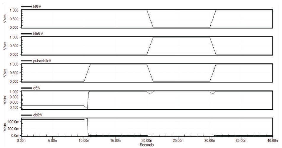 The waveform of 1bit of SRAM cell using pulsed latch in three different technologies that is 45 nm, 90 nm and 180 nm are shown in Figure 5(b), 5(c), and 5(d) respectively.