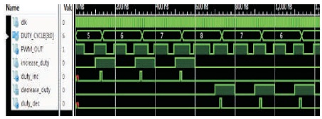 A defect is a mistake caused in a device during its fabrication process. The logic values obtained at the device's primary outputs, whereas applying a take a look at pattern to some device under test (DUT). A fault is said to be identified by a take a look at patterns at the output that is the simulation waveforms are totally different than the expected output. In Figure 5, the fault models are observed in the simulation waveforms. The red coloured unwanted waveforms are obtained indicating a fault occurred in the circuit. Figure 6 shows the simulation waveforms of pulse generator indicating ATPG works continuously to identify faults and remove faults during the propogation.