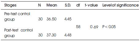 Hypothesis 1There is no significant difference between the pre-test of control group and post-test of control group in achievement mean scores of the pupils in learning grammar in English.