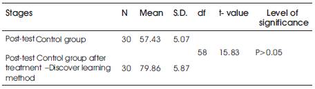 Achievement mean scores of the learners in post-test of control group is 57.43 and the achievement mean scores of the learners post-test of Experimental group is 86.76.Score of the post-test of Experimental group (86.78) is greater than Pre-test of Experimental group (57.43) It shows that learning through Discovery learning is more effective than conventional methods.
