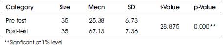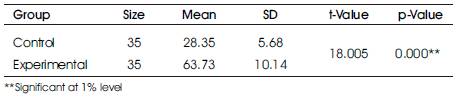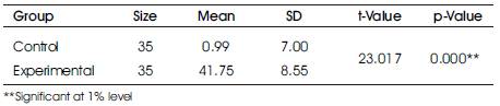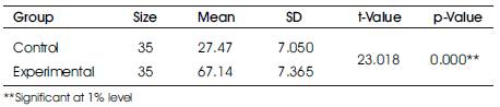 In the Table 3, since p value is less than 0.01 in the scores of the speaking skill, the null hypothesis is not accepted at 1% level of significance. Hence, there is a significant difference between the pretest and the posttest scores of the experimental group. The mean scores show that the experimental group performed better in the posttest than the pretest.