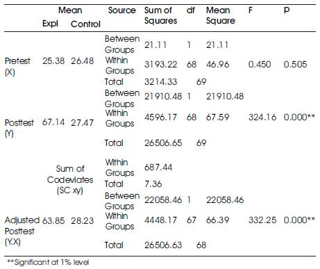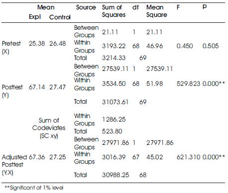 The t-tests for independent sample means and ANCOVA were the statistical techniques employed for interpreting the results. The results were interpreted with a level of significance at 0.01 level.