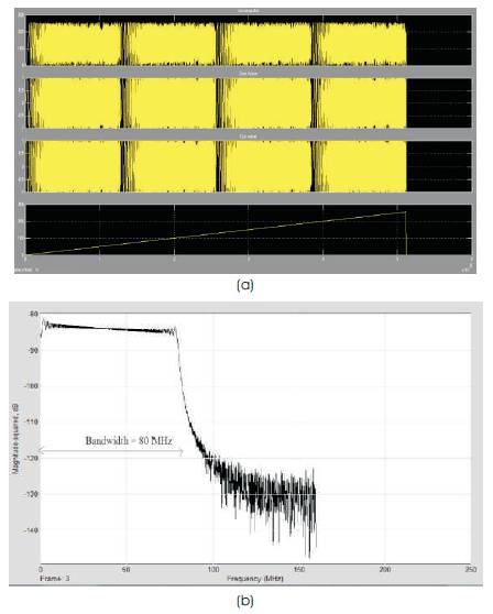 In this paper, chirp signal is generated by varying the control word for the Phase Accumulator (PA) block. An increasing ramp output is given as input step word to the phase accumulator. By continuously varying the control word, there will be variation in the output frequency generated by the model as shown in Figure. 9. The input clock frequency is 320 MHz, step size in ramp generation block is 0.01 and 8 whole bits and 6 fractional bits are used in this model. We can also vary the start frequency by giving the start word in the second constant block present in the model. The output frequency will be varied till half of its input frequency obeying the Nyquist criterion. When using all the bits in phase accumulator, complete chirp will be generated and frequency generated will be half the input clock frequency, which is from 0 Hz to 160 MHz as shown in Figure 10(b). The BW of the system can also be decided by considering only the MSB bits and truncating the LSB bits coming from the word generator and thus generalize the system for any of the specified applications. In Micro-SAR, bandwidth required is 80 MHz, and therefore, 6 MSB bits are used as input to phase accumulator. Bandwidth of the generated chirp signal is 80 MHz as shown in Figure 11(b). Table 2 gives the specifications of the output signal generated with different MSB bit length.