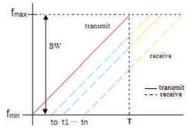 Figure 2 shows the LFM-CW transmit/receive model of frequency versus time. Received returns off targets are time delayed, (t0...tn) transmit signals. Targets further in range correspond to a greater frequency difference. In the figure, T represents the duration of one up-ramp, or half the PRI.