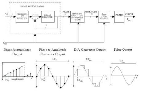 Figure 3. A simple block diagram of digital direct synthesizer and the signal flow in the DDS