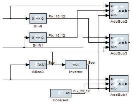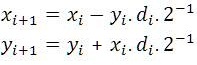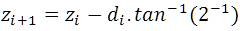 CORDIC has two operating modes, Vectoring mode and Rotation mode. This model uses the vectoring mode, and the equations used for the iterations are given in Eq. (4)( Ray Andraka, Jan-1998).