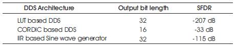 (where q is the number of the LSB) (Vankka, J. 2001). The assumption that the quantization noise appears as white noise and is spread uniformly over the Nyquist bandwidth is simply not true in a DDS system. If the output frequency is an integral multiple of input clock frequency, then the quantization noise will occur at multiples of the output frequency. If the output frequency is slightly offset, then the quantization noise will become more random, thereby giving an improvement in the effective SFDR. Comparison of the parameters in different architectures is shown in Table 1.
