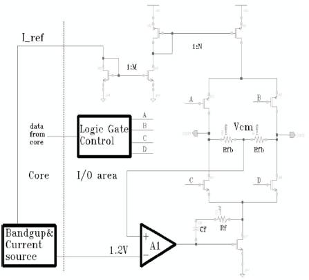The diagram contains a bandgap voltage reference providing stable voltage ~1.2V as well as a current reference block providing I/O cell supply current. Also included are current mirrors, an output driver (four switches), a differential amplifier placed in negative feedback operation mode, and a logic gate control block. The operation is as follows: The bandgap voltage reference provides a stable 1.2V voltage. This voltage is applied to the positive input of the differential amplifier. The current reference circuit provides a reference current to the current mirrors. The current mirrors supply all internal blocks of I/O and provide the output driver current. The output driver contains internal resistors Rfb. A portion of the driver's current flows through the Rfb resistors and provides Vcm internal voltage offset. The Vcm internal voltage offset comes to the negative input of the differential amplifier. The differential amplifier compares both voltages on positive and negative inputs and drives transistors so that Vcm voltage is equal to the 1.2V reference voltage. Also the sink current is equal to the source current on this diagram. The logic gate control block drives transistors A,B,C and D in opposite phases to provide a differential signal between padn and padp points.