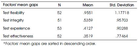 Table 4 presents the gaps between all pairs introduced in Table 3. Comparison of these gaps shows that there is a significant difference between test flexibility (gap=1.17718) and all the three other gaps (t(50) =-3.777, p<0.01, t(51) =-3.444, p<0.01, t(49) =2.666, p<0.0 1). On the other hand, there is no significant difference between the gaps relating to the other three factors. The meaning of these findings is that with regard to every single gap out of these four, there is a significant advantage to computerised tests in comparison to a traditional one. Further more, relating to tests' flexibility, the benefit of CAA is significantly greater in comparison to their advantage concerning the other three factors.