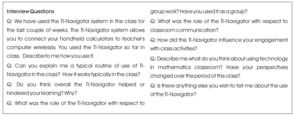 The above discussion provides strong evidence to support incorporating technology in teacher education programs so that it can positively shape pre-service teachers' attitudes towards the use of technology and time can play a critical role for both school teachers and teacher educators in incorporating technology in their classrooms. As time can play a crucial role in adopting various technologies and demonstrating their pedagogical use during a methods course, it is important to ask how much instructional time should be spent on a particular technology for pre-service teachers to gain a significant understanding of it and its potential use. The technology used in this study was the TI-Navigator system, which is an instructor-monitored wireless system for TI Nspire CAS calculators. To guide this study, we ask the question: is there a difference in identifying the potentials of a new technology between two groups of pre-service teachers who used the technology for different instructional lengths in time?