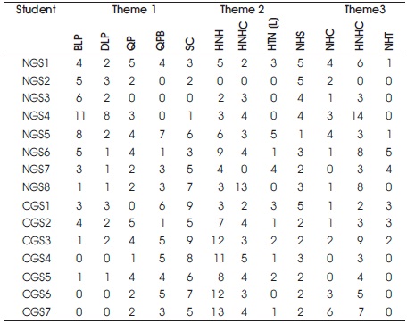 To answer this question statistically, qualitative data were quantified by using the frequencies of coding units under each identified theme (see Table 2). Below, the Table 3 summarizes the considered coding units for each of the themes. As the sample sizes were smaller, eight and seven participants in the Navigator group and Calculator group respectively, the Levene's test and the test of Normality Assumption were carried out. For both tests, the null hypotheses failed to be rejected as p>0.05. This implies that there was no difference in the population variances of the two groups and that the Normal Assumption holds for each group across all three themes. Thus, we utilized the independent samples t-test to compare differences between the two groups.