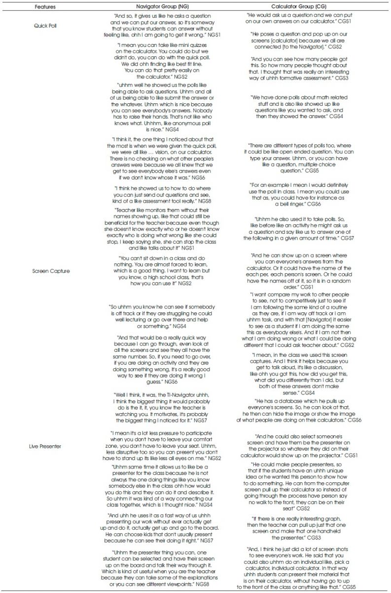 Screen Capture and Quick Poll were the two most described features of the system by the participants (see Table 2). All the participants except NGS3 described the Screen Capture at least once. Except the participant NGS3, all the other participants described the Quick Poll feature or its possible benefits. Three participants from the Calculator Group, CGS4, CGS6, and CGS7, never mentioned the Live Presenter feature while the rest of the participants described the feature or its benefits at least once (see Table 2). The participants described these features when they were describing how the system helped their learning, classroom communication, or how the system can help in teaching. Comparison of participants' responses between the two groups are given in the Table 5. Participants also described how the Live Presenter feature could help students to share their work with the whole class without going to the front of the class, which can be extremely uncomfortable for some students. In both groups, participants not only were able to describe the features of the technology they used but also were able to describe its possible benefits. As the participants were aspiring secondary mathematics teachers, they described how the technology helped their own learning and how it can be helpful in teaching.