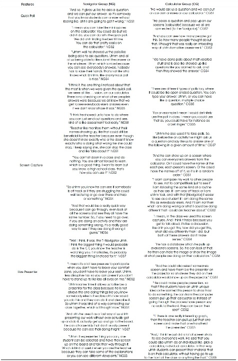 Participants also identified that knowing the teacher is monitoring their calculator screens encouraged them to stay focused on the classroom activities. All of the participants were seniors, and many of them described that they were self-motivated to actively participate in the classroom activities regardless. However, they learned that the teacher could help them as they need it through the calculator screen monitoring. Responses like “So I feel like it's a really good tool because it allows the teacher to not only watch the students and see if they are actually paying attention but also see if they are discovering it” (CGS7), “And then on the screen the teacher could look at what all of us are working on and make sure we are on the task”(CGS1), “And I think in our case the student still following and still learning but in a middle school classroom or high school classroom, you want all your students to be doing it, so that they will learn how to do it” (NGS3), and “it's a pretty good push to stay on task, because you're like 'Oh, the teacher might see that I'm goofing off instead of doing my work” (NGS5) are evidence to support that participants held positive perspectives on the instructor-monitored classroom environment generated through the student response system. The above qualitative data along with the quantitative analysis summary of Table 3 suggest that there is no difference in participants' ability to describe how the system helped their learning between the two groups. 5.4.3 Theme 3: The Ability to Describe how the System would help Teachers During the interviews, participants described the possible use of the system in their future mathematics classrooms, even when this was not directly asked within the interview question (see appendix 1 for interview questions). Participants considered that monitoring students' calculator activities and checking their understanding within a lesson itself are very important to them. They frequently described the potential use of Screen Capture and Quick Poll in their future classrooms. Participant 7 from the calculator group said, “Like checking for understanding is very difficult in a classroom setting because there are so many students and sometimes students are afraid to raise their hand”. Another participant said, “I think it helps tremendously with checking for understanding throughout the lesson. And a little way to assess how their understanding or check to make sure they are even participating” (CGS4). Participants also explained that through the monitoring, they should be able to address the issues immediately rather than at a later time. Responses like “So you are able to see, you know, where they may be [having] misconceptions or where they may be going on a different path or you know things like that,” (NG01) and “It allows you to check for understanding and see if may be one student hasn't done anything on their calculator. Then you know that they might not know how to do it,” (NGS2) are evidence to support the above claim. Participants from both the Navigator group and Calculator group, which used the system for 14 weeks and three weeks respectively, also described how the system could help to create a comfortable environment for students to share ideas, especially for students who might not regularly talk in front of the class for various reasons. Responses like “Leaders of your group will answer and will participate but you are not going to get participation from someone who may be not confident about their math skills. Everyone can participate, it is anonymous” (NGS2), “He can choose kids that don't usually participate because he can see they're doing it right. It's easy to pick on those students who usually wouldn't put themselves out even if they have the right answer” (NGS7), and “especially with students who are shy, don't want to get their answers across, it could be an easier way for them to get their thoughts towards the teacher without being known who it was” (CGS1) are evidence to support this claim. Responses such as “I mean it's a lot less pressure to participate when you don't have to leave your comfort zone, you don't have to leave your seat” (NGS2) and “it's a cool way to have people present, their ideas with the presenter mode. They don't have to get up and go in front of the class” (CGS1) further explain how the system can help students to share their mathematical thinking with the teacher and the whole class. Again, the above qualitative data indicate how the participants from both groups explained the use of technology in their future classrooms and the statistical comparison in Table 3 supports the claim that there is no statistical difference in responses between the two groups.