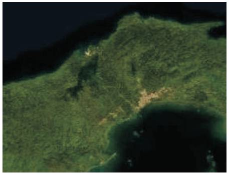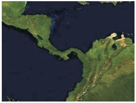 Figure 2. The Panama Canal extends from Panama City on the Pacific Ocean to the south across Lake Gatún to the Atlantic Ocean to the North. Microsoft Bing NASA image.