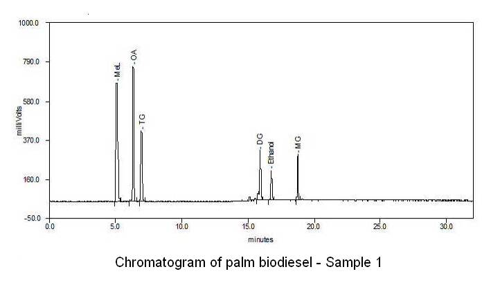 Figure 1. Chromatogram of palm-biodiesel – Sample 1, Wt % of Oil: Methanol: Catalyst: Booster = 6 : 1 : 0.56 : 0.11