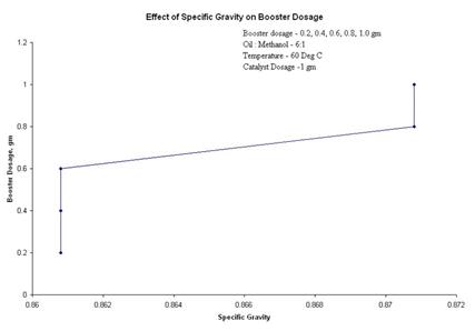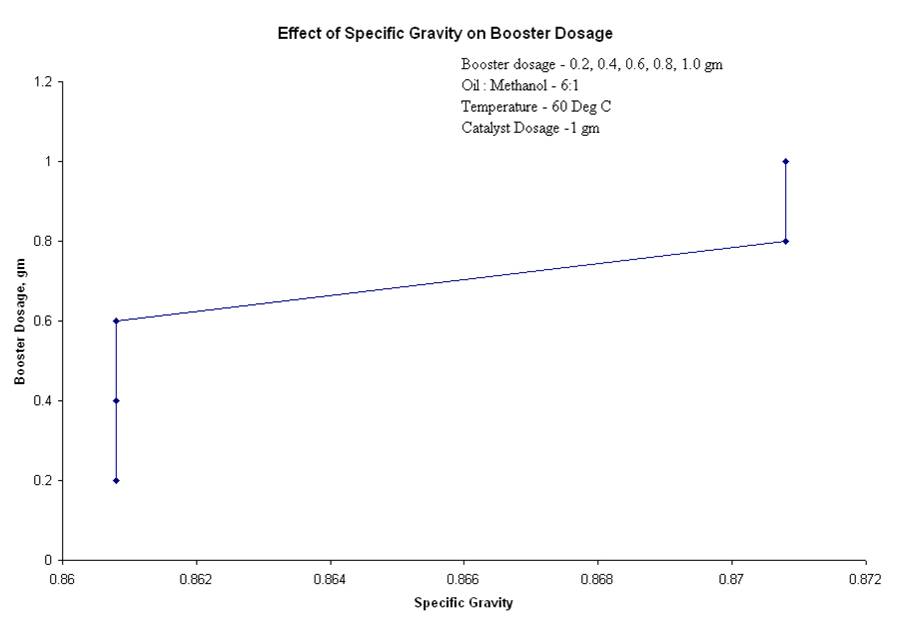 4.2.5 Effect of Specific gravity on booster dosageLower value of the specific gravity of the final product is an indication of completion of reaction and removal of heavy glycerine. The influence of molar ratio, temperature and catalyst quantity on the specific gravity of the biodiesel was studied by Miao and Wu [3], 2006. From Figure 10, it is concluded that with the increase of the booster dosage the specific gravity increased. The optimum value of Specific gravity was obtained at 0.8 gram of booster dosage.