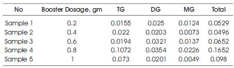 The experimentation was carried out for varying booster dosages from 0.2 to 1 gms at a temperatures of 60oC. The experimentation results show that the biodiesel obtained at the conditions of oil: alcohol ratio, 6:1, at catalyst dosage 1 gram, at a temperature of 60oC and booster dosages of 0.2 to 1 gram was of good quality as shown in Table 1. Therefore, at the temperature of 60oC, five samples are analyzed using HPLC (High Performance Liquid Chromatography) and the presence of the bound glycerol (MG, DG, TG) is obtained.