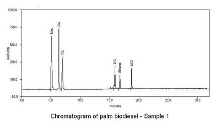 About 100 mg of each sample was weighed into a 10ml volumetric flask and diluted to the mark with ethanol. 10μL of the resulting solution was injected onto the HPLC (High Performance Liquid Chromatograpgh) column. The amount of individual glycerides present in each sample was determined based on the response obtained from the chromatogram and the calibration function for each glyceride.