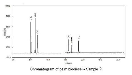 Figure 2. Chromatogram of palm-biodiesel- Sample 2, Wt % of Oil : Methanol : Catalyst : Booster = 6 : 1 : 0.56 : 0.23