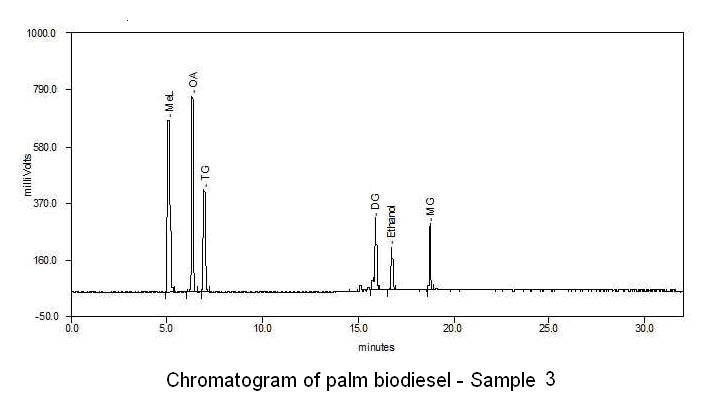 Figure 3. Chromatogram of palm-biodiesel – Sample 3, Wt % of Oil : Methanol : Catalyst : Booster = 6 : 1 : 0.56 : 0.34