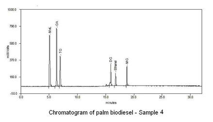 Figure 4. Chromatogram of palm-biodiesel – Sample 4, Wt % of Oil : Methanol : Catalyst : Booster = 6 : 1 : 0.56 : 0.45