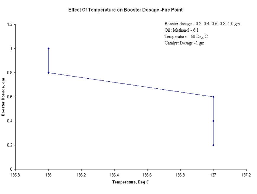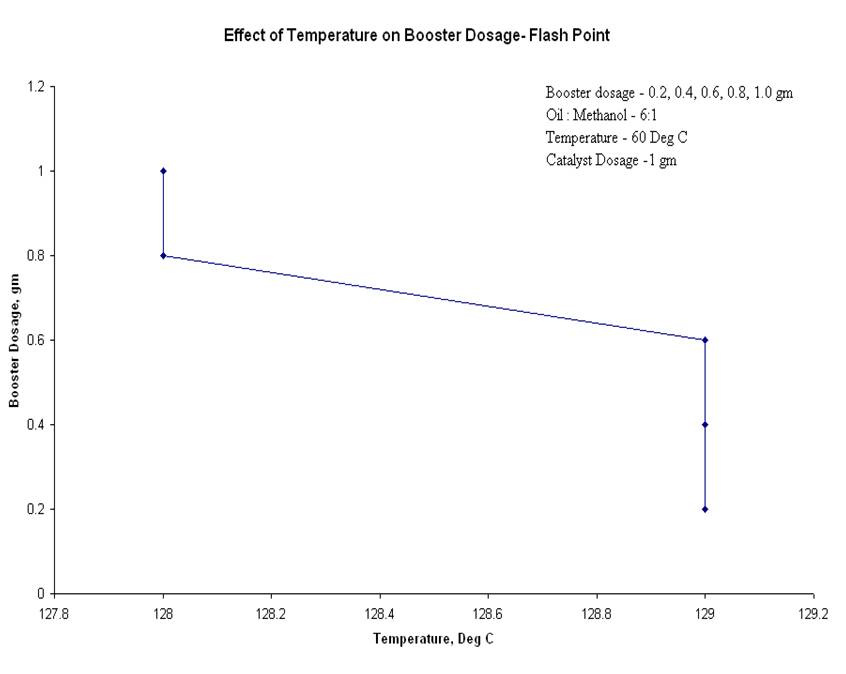 4.2.1 Effect of temperature on booster dosage for Flash PointThe effect of temperature on booster dosage for flash point was studied at the conditions of oil: alcohol ratio, 6:1, at catalyst dosage 1 gram, at a temperature of 60oC and booster dosages of 0.2 to 1 gram. It was observed that with the decrease in the booster dosage the temperature increased the flash point. Thus, it was observed that the equilibrium conversions increased substantially for every degree rise in temperature. Hence, rate of reaction is strongly dependent on temperature of reaction [2]. Therefore the optimum value of Flash Point was obtained at 0.8 gram of the booster dosage as shown in Figure 6.