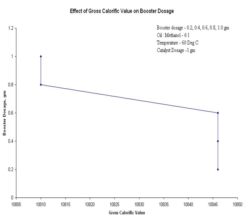The experimentation results show that the biodiesel obtained at the conditions of oil: alcohol ratio, 6:1, at catalyst dosage 1 gram, at a temperature of 60ᵒC and booster dosages of 0.2 to 1 gram was of good quality. It was observed that adding the booster resulted in less soap formation.