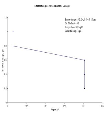 4.2.4 Effect of Degree API on booster dosageFrom the Figure 9 it is concluded that with the decrease in the booster dosage, the Degree API value increased. Therefore the optimum value of Degree API was obtained at 0.8 gram of the booster dosage.