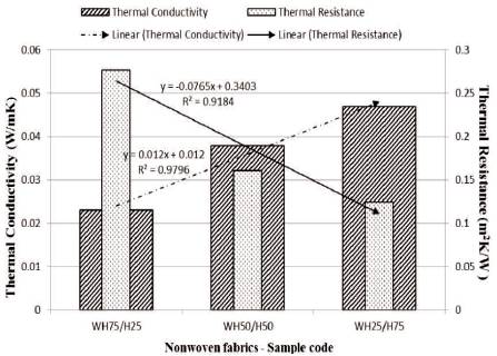 Figure 6 shows the influence of blend proportion of water hyacinth fibers on thermal conductivity and thermal resistivity of the nonwoven fabrics. The thermal conductivity of the nonwoven fabric decreases with the increase in the blend proportion of water hyacinth fiber and also due to increase in thickness of the fabric. The thermal resistance of the nonwoven fabric has the positive correlation with the thickness of the fabric. The result shows that the increase in the blend proportion of water hyacinth fiber tends to increase the thermal resistance of the nonwoven fabric.