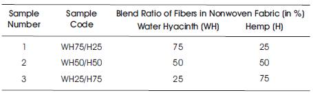 The characteristics of the fiber and the methods of manufacturing process influence the thermal properties of the nonwoven fabric. Since water hyacinth fiber is a hollow and shows good thermal conductivity the fiber is much suitable to produce the thermal insulation materials. Due to less cohesiveness, processing of 100% water hyacinth fibers is not practically possible. Hence the effect of water hyacinth fiber on the thermal insulation properties is thus analyzed by blending with hemp fibers, which also having good insulation properties analyzed in earlier researches ([3], [13]). The different proportions of water hyacinth with hemp fibers, such as 75:25, 50:50, and 25:75 are studied. The details of the nonwoven fabric construction and their nomenclature are given in Table 1.