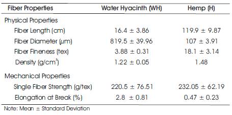 The mechanical properties of the water hyacinth and hemp fibers are given in Table 2. The single fiber strength of the water hyacinth and hemp fibers are 220.5 g/tex and 232.05 g/tex, respectively. Both the fibers show the similar strength characteristics which are suitable to produce the nonwoven fabrics. The elongation of the water hyacinth and hemp fibers are 2.8% and 0.47%, respectively describes that the water hyacinth fibers are flexible and able to produce the nonwoven fabrics.