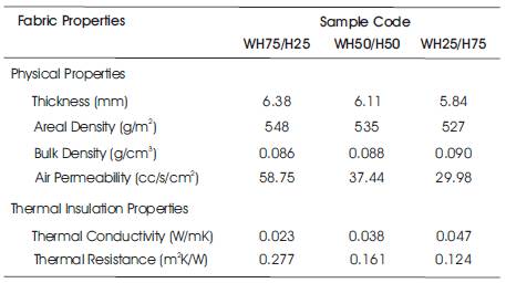 The physical and thermal insulation properties of needle punched nonwoven fabrics of water hyacinth/hemp blends were shown in Table 3. From the table, it is observed that the properties, such as thickness, areal density, bulk density, air permeability, and thermal conductivity of the nonwoven fabrics are significantly influenced by the blend proportion of water hyacinth fibers.