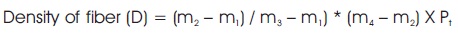 where, m1 – Mass of empty standard measuring glass (gm), m2 – Mass of standard measuring glass with staple fibers (gm), m3 – Mass of 50 ml water in the standard measuring glass (gm), m4 – Mass of standard measuring glass with staple fibers and water (gm), and Pt – Density of water (g/cm3).