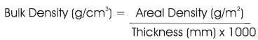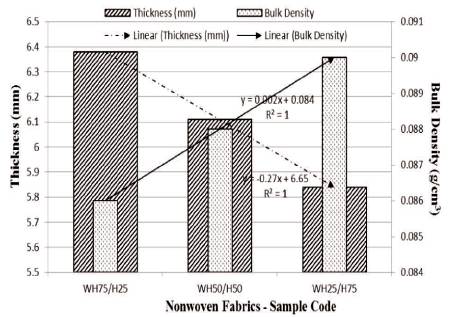 The physical properties, such as Thickness (ASTM D 5729 – 97), Areal Density (ASTM D 6242 – 98), and Air Permeability (ASTM D 737 – 96) of the water hyacinth/hemp needle punched nonwoven fabrics were tested according to the standard ASTM test procedures. The Bulk Density of the needle punched nonwoven fabric is calculated using the following equation,