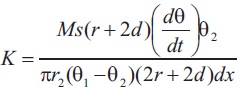 The specimen was mounted on the steam chest brass cylinder with thick brass base (B) of same diameter of the sample. The thermometers were inserted to both steam chest and metallic disc. The steam chest was connected to a boiler and the steak was allowed to pass through. When the steady state temperature was attained, the readings θ1 and θ2 of both the thermometers T1 and T2 , respectively were noted. The specimen is then removed from the disc. Place the chamber to contact the disc directly. The disc gets heated more rapidly. Remove the steam chamber when the temperature raises 7-8 oC above the steady state temperature (θ2). Now, allow the disc to cool and start a stop clock when the temperature falls exactly to 5 oC above θ2. The temperature is noted for every 30 s till it reaches 5 oC below θ2. The thermal conductivity of the nonwoven fabric is calculated using equation (3).