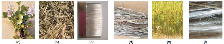 Figure 1. (a) Water Hyacinth Plant, (b) Dried Stem, (c) Needle Comb, (d) Water Hyacinth Fiber, (e) Hemp Plant, (f) Hemp Fiber [5]