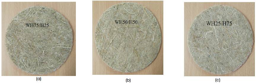 The fibers were pre-cut to the staple length of 6–9 cm and manually opened to prevent from undesirable damages during the process. The fibers are then blended in the proposed ratios as given in Table 1. Mixing is done manually to ensure the homogenous web before feeding them into the Dilo nonwoven plant to produce the needle punched nonwovens. The machine consists of card, circular drum, and needle room. The fibers feed are carded, overlapped, and needle punched by the barbed needles. The Dilo nonwoven plant has the machine width of 100 cm where the working width is about 60 cm. The parallel laid web were produced from the carding and fed into the needle room with 30 laps overlaid. In the needle room the fabric is produced with the needle penetration depth of 12 mm with the punch density of 25 punch/cm2 using the 2500 needles placed as 2 needle boards with the needle motion of down strokes at the frequency of 225 strokes/min. Figures 2 (a), (b), (c) represent the WH75/H25, WH50/H50, and WH25/H75 nonwoven fabric, respectively.