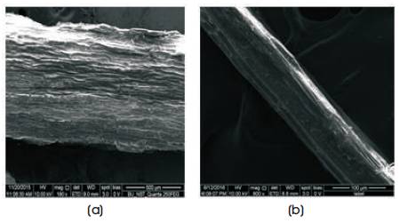 Figure 3. SEM Image (a) Water Hyacinth Fiber – 180x (b) Hemp Fiber – 800x