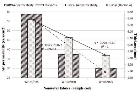 Figure 5 shows the influence of blend proportion of water hyacinth fibers on air permeability and thickness of the nonwoven fabrics. From Figure 5, it is clear that the increase in the blend proportion of water hyacinth fiber tends to increase the air permeability of the fabric with increase in the thickness of the fabric.