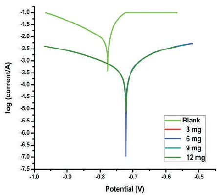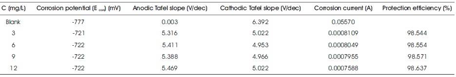 The relationship between the potential-current for the Al electrode in the 3 M HCl with different amounts of 1, 1-biss- 2-Naphthol are shown in Figure 1. The results of Tafel plots are shown in Table 3. The value of corrosion current density in the bare solution is high compared to the protected systems. This shows that presence of 1, 1-biss-2-Naphthol hinders the disintegration process of Al in the 3 M HCl solution. Presence of inhibitor 1, 1-biss-2-Naphthol cause reduction in the Al corrosion rate, so it moves cathodic and anodic Tafel curves to lower corrosion current density values. This confirms that anodic dissolution and hydrogen evolution are protected. This nature is due to the adsorption of 1, 1-biss-2-Naphthol, on the corroding Al surface. The anodic and cathodic Tafel slope values were not significantly varied towards any direction and also changes in the corrosion potential value is not greater than 85 mV. This shows the mixed corrosion inhibition property (inhibition of both cathodic and anodic reaction) of 1, 1-biss-2-Naphthol, over the surface of Al in the 3 M HCl solution.