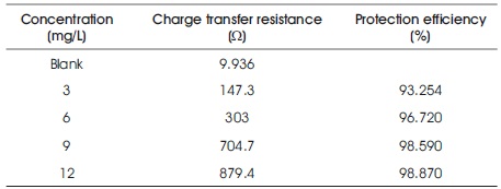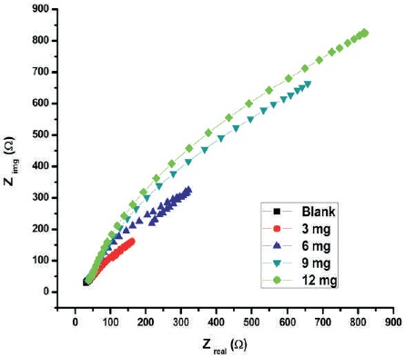 Impedance spectroscopy study results are shown in Figure 2 and Table 4. It is observed that the area of depressed semicircle increases with inhibitor concentration of 1, 1-biss-2-Naphthol, which is due to the charge transfer process. The charge transfer resistance is a measure of electron transfer process at the metal corrosive solution interface and it has inverse relationship with the aluminum corrosion rate. The increased charge transfer resistance values with increase in the inhibitor concentration 1, 1-biss-2-Naphthol, is a hint of corrosion inhibition property of 1, 1-biss-2-Naphthol, over the Al surface in the 3 M HCl solution. The protective layer formed by the 1, 1-biss-2-Naphthol, over the Al surface increases the impedance of the surface of the electrode to the electrochemical corrosion. The maximum protection efficiency obtained from the impedance spectroscopy technique is 98. 870%.