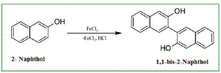 2- naphthol (10 g) and 100 ml of double distilled water in a 250 ml conical flask were taken and heated until the mixture starts to boil. Then, 15 g of aqueous ferric chloride is added to the hot solution. The reaction is carried out for one hour and filtration is carried out by using suction pump. The resulting sample (1, 1-biss-2-Naphthol) is crystallized by toluene. The melting point of the resulting compound is 215 0C [Scheme 1]. The inhibitor of four different amounts, i.e. 0.1 g/L, 0.2 g/L, 0.3 g/L, and 0.4 g/L is prepared. The 3 M HCl environment was prepared from the analytical grade HCl and double distilled water. Weight loss and gasometric studies were carried out with 100 ml of 3 M HCl system containing 3 mg/L, 6 mg/L, 9 mg/L, and 12 mg/L of 1,1-biss-2-Naphthol at 60 0C. The aluminum metal pieces are completely submerged in the 3 M HCl solution. After 1, 2, 3, 4, days, the Al metals are retrieved from the harsh acid environment and weight loss of the Al were recorded.