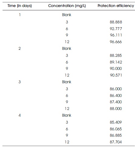 Table 1 shows the weight loss data of Al in 3 M HCl without and with of 1,1-biss-2-Naphthol at 60 0C. From Table 1, it is observed that the corrosion rate of aluminum in 3 M HCl solution with1,1-biss-2-Naphthol decreased and the protection efficiency enhanced progressively with enhancing the inhibitor concentration, which showed that electron rich groups present in the inhibitor 1,1-biss-2- Naphthol gets adsorbed on the Al surface. The reduction in the aluminum corrosion rate in the presence of 1, 1-biss- 2-Naphthol, is due to the positive (inhibitive) effects of 1, 1- biss-2-Naphthol. The maximum protection efficiency of 96.666% was successfully achieved at 12 mg/L of Al for immersion period of 1 day. But, at higher immersion period, the protection rate drastically decreased to 87.704% at 12 mg/L of 1,1-biss-2-Naphthol for four days immersion period. The enhancement in the Al corrosion rate is a complex phenomenon because at higher immersion period, rapid etching, desorption, and decomposition of 1,1-biss-2-Naphthol molecules take place.