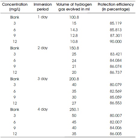 From the amount of hydrogen gas evolution, the protection efficiency of the 1,1-biss-2-Naphthol can be calculated by the below relation,